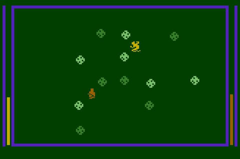 The game board is a 9×9 grid with the light army on one side and the dark army on the opposite side (very chess-like). Also on the grid are 5 flashing red “power” points. Which-ever side (light or dark) controls all 5 of these points will win the game. This grid is called the ‘strategy’ screen and when two opposing pieces move to occupy the same grid square on any turn-based round, the game switches to the “combat” screen. Here, the joystick controlled pieces must battle it out with what ever weapons and powers they have at their disposal.