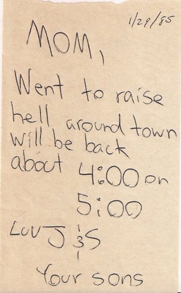 Just in case you had no idea who you are dealing with when you come to this site, here is note we wrote our mom in 1985. She saved it. That has to mean something.
