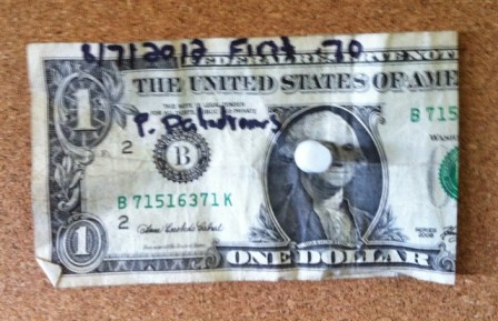 We put this on our bulletin board. It represents the first dollar we earned from our first game as an indie game studio (partnered with Producto Studios). It’s folded to 70% to represent the cut Apple took.