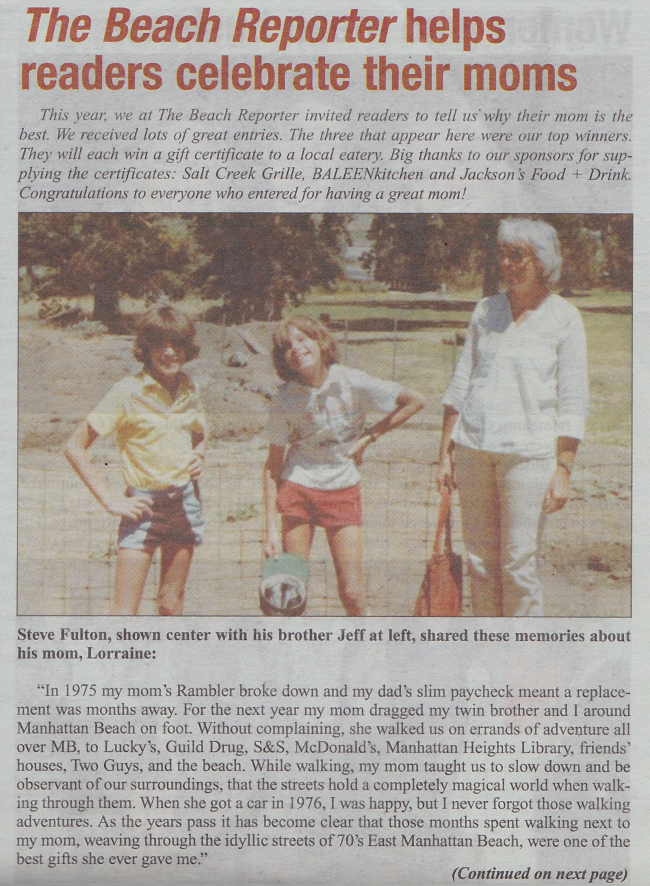 I entered (and won) a local writing contest for Mother’s Day with the following story about my mom. When she saw it today, she had no idea I even remembered what happened in 1975, much less would write about it. I think I blew her mind.