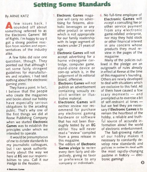 I was looking through my old copies of Electronic Games, and I happened upon an editorial by Arnie Katz from the March 1983 issue. It lists the “standards” that the publication had decided to employ to make sure that they were creating the best magazine for their audience. IMHO, I believe these became the defacto standards for game journalism until the “preview” era of the 1990’s turned everything on it’s head. It did not get much at the turn of the 21st century, when the web made everyone “a game journalist”. (By the way, for this exercise, the first three items, while interesting, are not as important as the last three).
