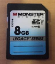 - First, you must find or purchase a standard SD card that is 8 GB or less. It needs to be standard SD. No mini-SD, SDIO or SDXC. I used a Monster 8GB Legacy SDHC Card that my brother found (no joke) at Rite-Aid. That was the only brick and mortar store we could find that sold them.