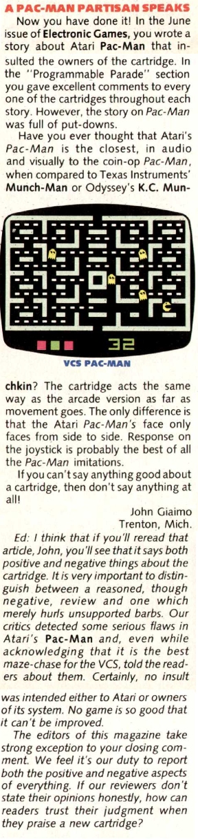 I recall distinctly reading that exchange in the Reader Response section of the magazine and nodding my head in agreement.    The Electronic Game VCS Pac-Man review was the first time (I saw)  a publication being truly honest about a video game, and their opinion matched mine.   I knew it would not be the last time.