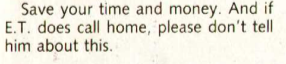 “Save your time and money. And if E.T. does call home, please don’t tell him about this”.