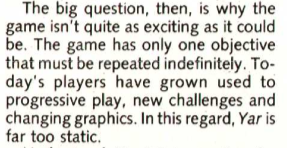 For example, Yar’s Revenge is considered a classic now, but in the wake of the Pac-Man review, no Atari VCS game got a free pass.   In the October 1982 issue of Electronic Games,  it was called “Far too Static”, even though it was a play on the arcade game Star Castle, and was arguably, a deeper and more challenging experience than that game.