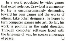 I knew of Crawford in his Atari days, and his work struck me as singular, unique and fascinating. I played his games in the 80s, read his various articles in magazines, and generally associated him with my good thoughts about Atari Inc. from the golden age.