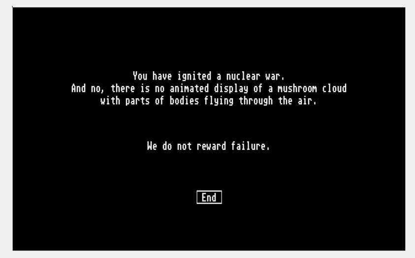The game would be serious, it would be very educational, and I think it would grab a great deal of attention. It would not be action packed, but I think that the launching of Armageddon would be far more wrenching in this game than missile command ever was.